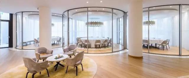 Vitrocsa 公司的骚操作可不止于此,除了把门窗嵌入墙壁外,还可以利用垂直轨道和三点控制,把它们整面嵌入地下和天花板里;同时也擅长制造这种弧形推拉门,在室内创建出高逼格的独立空间,通过弧形轨道来打开关闭。